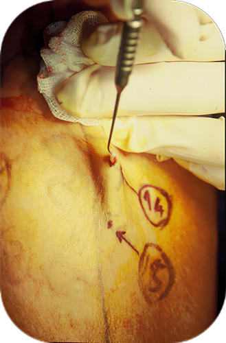 Elles siègent très superficiellement sur la partie interne du haut de la cuisse (photos 1 et 2) , d’un seul côté ou des deux,sont souvent multiples et très sinueuses Elles communiquent directement avec le réseau veineux intra-pelvien par des veines dites honteuses internes ou par des veines venant de l’utérus et seulement très indirectement avec les varices ovariennes du SCCP. Qu’elles soient associées ou non à celui-ci, la technique la plus simple et la plus rapide pour les enlever, de surcroit la plus esthétique et dont les suites sont simples et sans douleurs, est la phlébectomie. Ce geste chirurgical permet, via des incisons millimétriques ne laissant généralement aucune trace, de les enlever ponctuellement une par une à l’aide d’un petit crochet adapté (photo 4). Un repérage avec marquage préopératoire (photo 3) est indispensable pour n’en oublier aucune. L’opération est ambulatoire, le plus souvent menée sous anesthésie locale, les complications (petits saignements) bénignes et rares.